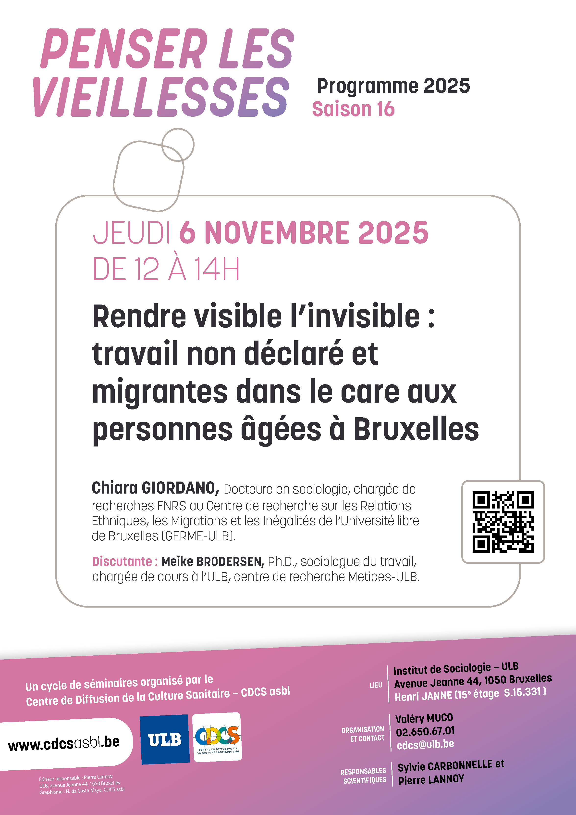 Le jeudi 6 novembre 2025, le CDCS accueille Chiara GIORDANO qui présentera les résultats d'une enquête menée entre 2018 et 2022 à Bruxelles sur le travail non déclaré dans le secteur du care aux personnes âgées.