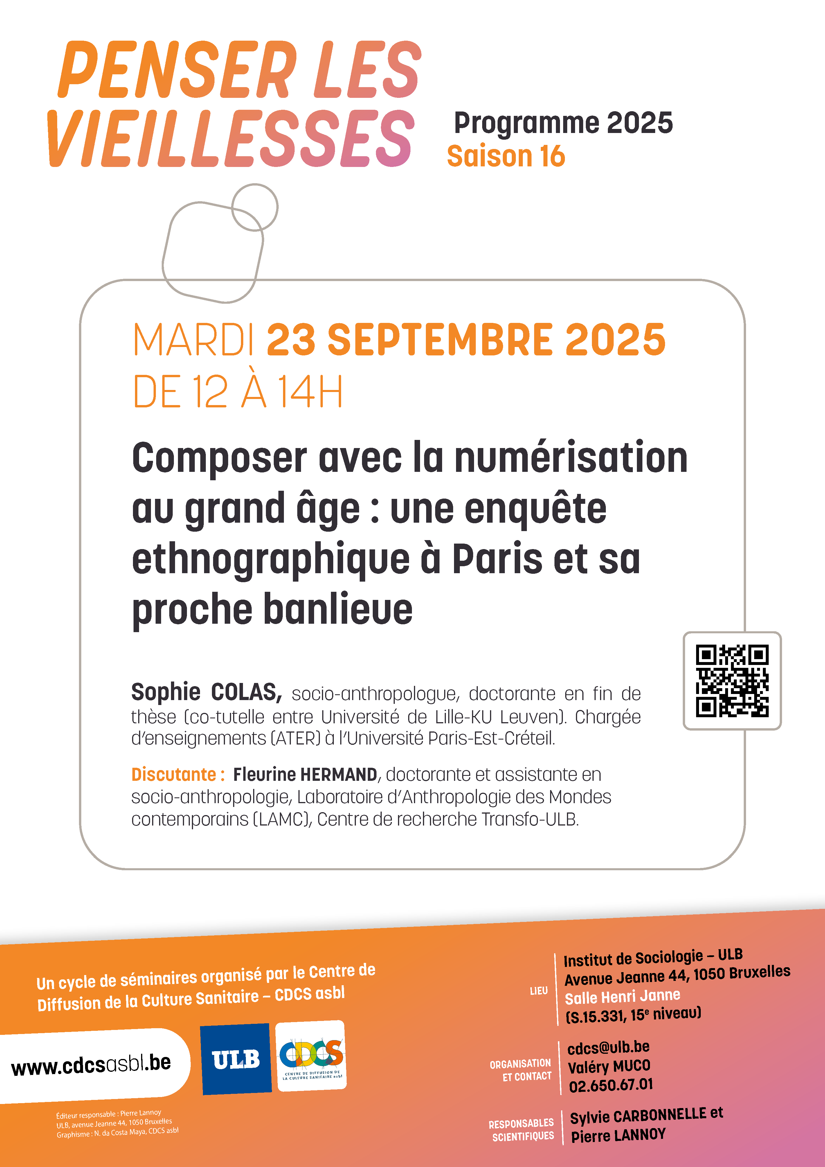 Le mardi 23 septembre 2025, Sophie COLAS sera l'invitée du CDCS asbl dans son séminaire Penser les vieillesses. Elle présentera "Composer avec la numérisation au grand âge: une enquête ethnographique à Paris et sa proche banlieue".
